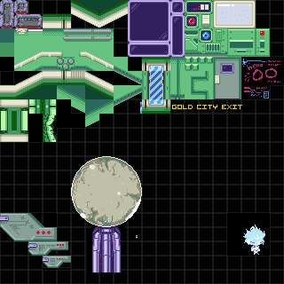 LIZA1 is the old onboard AI that served as a companion to people living aboard the Eliza Space Station allegedly orbiting the planet. Chunks of her and the station litter the ocean and mountains. Though a lot of her terminals have been vandalized, she can provide you with maps and files. Even more important than this, however, are her convenience centers! There is one in each sector. At them you can save, recover your energy, as well as teleport to any currently operational convenience center. She knows a lot of history, and is always happy to share everything she can. However, because she is a fairly old model super-robot she has no speech synthesizers like RISE5 and has to communicate by installed printers. If she's out of paper, she might just make a face and hope you get it. LIZA1 centers can be identified by expressive black and green spheres.